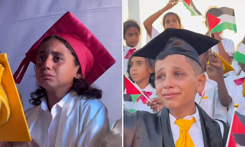 تقریب میں شریک بچوں نے روایتی یونیفارم اور ٹوپیاں پہن کر کامیابی کا جشن منایا، لیکن ان کی مسکراہٹوں کے پیچھے دکھ اور خاموش آنسو نمایاں تھے۔ ان میں سے کئی بچے ایک ہاتھ میں ڈگری تھامے ہوئے تھے اور دوسرے ہاتھ میں اپنے والدین یا پیاروں کی تصاویر اٹھائے کھڑے تھے۔