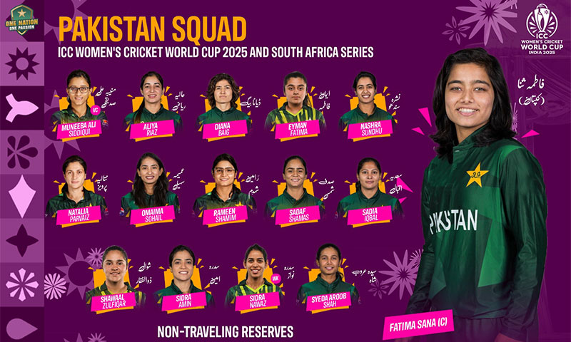 ویمنز نیشنل سلیکشن کمیٹی نے آئی سی سی ویمنز کرکٹ ورلڈ کپ 2025 کے لیے 15 رکنی قومی اسکواڈ کا اعلان کر دیا ہے۔ ایونٹ 30 ستمبر سے 2 نومبر تک بھارت اور سری لنکا میں شیڈول ہے۔ یہی اسکواڈ جنوبی افریقہ کے خلاف لاہور میں 3 ون ڈے میچز بھی کھیلے گا جو 16 سے 22 ستمبر تک قذافی اسٹیڈیم میں ہوں گے۔