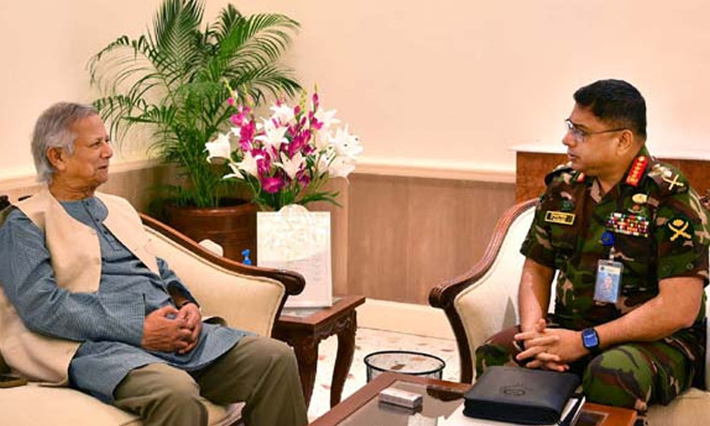 بنگلہ دیش کی عبوری حکومت کے سربراہ پروفیسر محمد یونس سے آرمی چیف جنرل وقار الزمان نے ملاقات کی ہے۔ اور واضح کیا ہے کہ فوج حکومت کے تمام اقدامات اور پروگرامز کو کامیاب بنانے کے لیے پرعزم ہے، افواہوں پر توجہ نہ دی جائے۔
