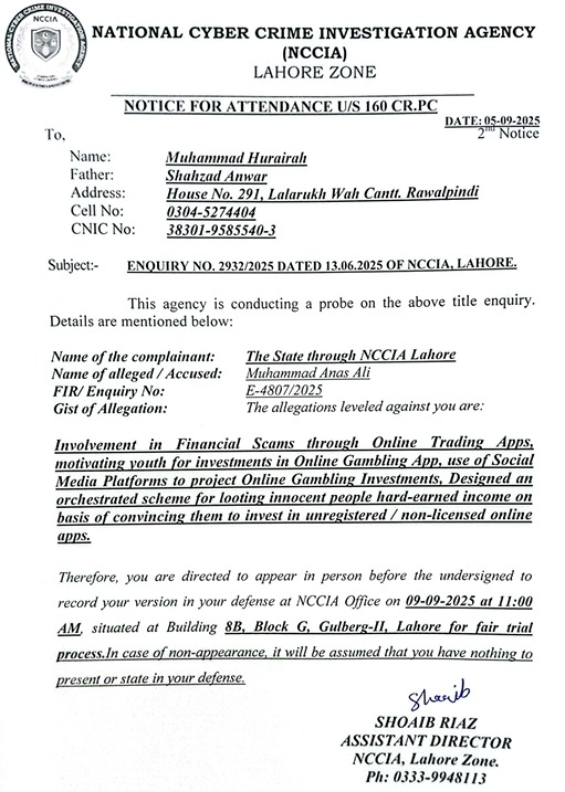 ادارے کی طرف سے نوٹس ندیم مبارک عرف نانی والا اور محمد ہریرہ کو جاری کیے گئے ہیں۔ دونوں کو 9 ستمبر کواین سی سی آئی اے لاہور میں طلب کیا گیا ہے۔