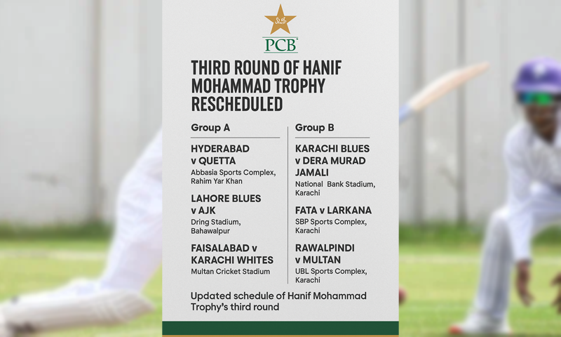 پاکستان کرکٹ بورڈ (پی سی بی) نے حنیف محمد ٹرافی کے تیسرے راؤنڈ کا شیڈول بارشوں کی پیشگوئی کے باعث تبدیل کر دیا ہے۔