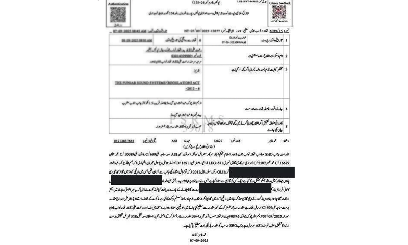 ایف آئی آر کے متن میں کہا گیا ہے کہ پولیس ناکہ بندی کے دوران بسم اللہ چوک پر ایک گاڑی کو روکا گیا جو قزلباش اشارہ کی طرف سے آرہی تھی۔ گاڑی میں اونچی آواز میں گانا ’جھانجر دی پاواں جھنکار‘ بج رہا تھا۔ ڈرائیور دانش علی سے استفسار پر اس نے بتایا کہ یہ اس کا شوق ہے اور وہ اکثر گاڑی میں اونچی آواز میں گانے بجاتا ہے۔