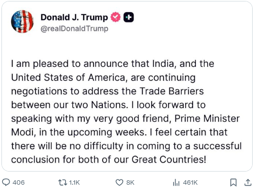 سماجی رابطے کے اپنے پلیٹ فارم ’ٹروتھ سوشل‘ پر جاری بیان میں ڈونلڈ ٹرمپ نے کہا کہ وہ اپنے بہترین دوست بھارتی وزیراعظم نریندر مودی سے آئندہ چند ہفتوں میں گفتگو کے منتظر ہیں۔ ان کے مطابق دو عظیم ممالک کے لیے کسی کامیاب نتیجے تک پہنچنا زیادہ مشکل نہیں ہوگا۔