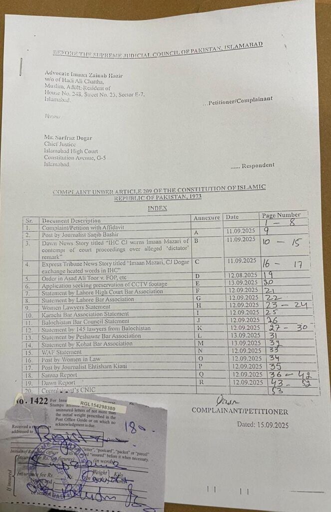 انسانی حقوق کی معروف وکیل ایمان زینب مزاری کی جانب سے سپریم جوڈیشل کونسل میں اسلام آباد ہائیکورٹ کے چیف جسٹس سرفراز ڈوگر کے خلاف شکایت دائر کی گئی ہے۔