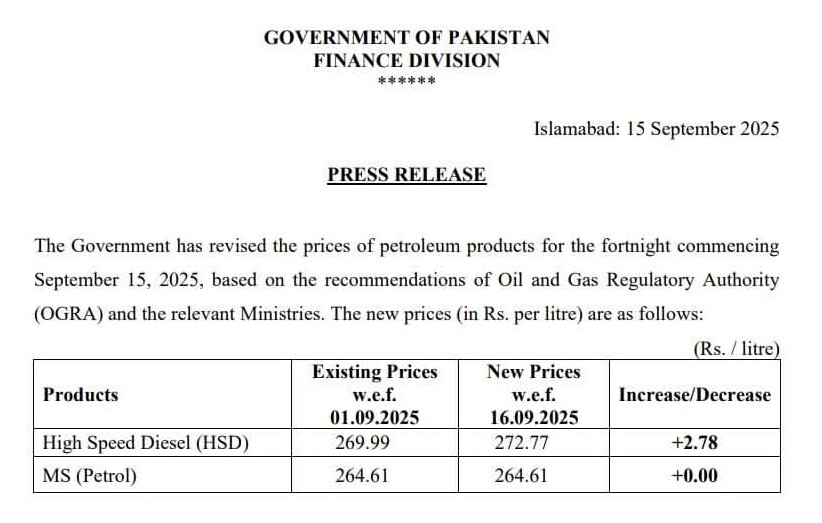 وفاقی حکومت نے آئندہ 15 روز کے لیے پیٹرولیم مصنوعات کی قیمتوں کا اعلان کر دیا ہے۔