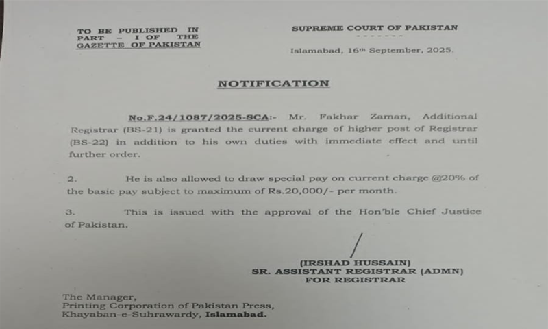 سپریم کورٹ کے ایڈیشنل رجسٹرار فخر زمان کو رجسٹرار سپریم کورٹ کا چارج دے دیا گیا۔