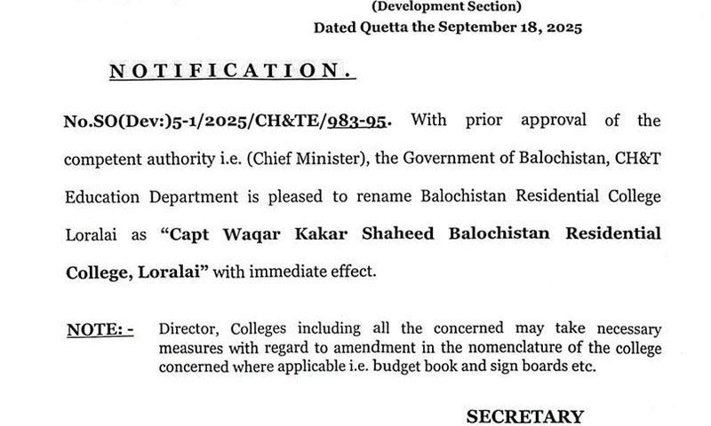 حکومت بلوچستان نے فورسز کے شہدا کی لازوال قربانیوں کو خراجِ عقیدت پیش کرتے ہوئے صوبے کے 2 اہم تعلیمی اداروں کے نام بدل کر انہیں شہدا کے نام سے منسوب کر دیا ہے۔