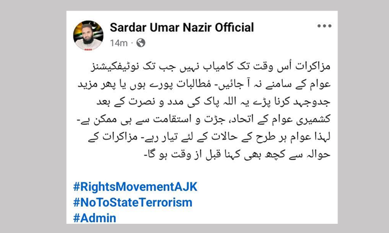 ایکشن کمیٹی کے مظفرآباد سے کور ممبر شوکت نواز میر کے آفیشل فیس بک پیج سے کچھ دیر قبل اعلان کیا گیا کہ مذاکرات کامیاب ہوگئے ہیں تاہم کچھ دیر بعد راولاکوٹ کے کور ممبر عمر نذیر کے آفیشل پیج پر بتایا گیا کہ مذاکرات کی کامیابی کے حوالے سے کچھ کہنا قبل از وقت ہوگا۔