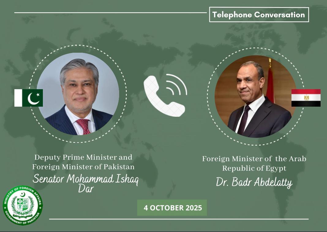 نائب وزیر اعظم و وزیر خارجہ سینیٹر محمد اسحاق ڈار نے مصر کے وزیر خارجہ ڈاکٹر بدر عبدالعاطی سے ٹیلیفونک گفتگو کی۔