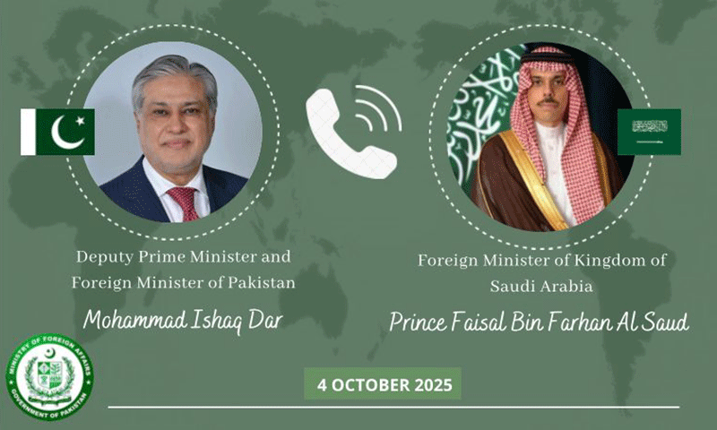 ڈپٹی وزیراعظم و وزیرِ خارجہ سینیٹر محمد اسحاق ڈار نے سعودی عرب کے وزیر خارجہ شہزادہ فیصل بن فرحان آل سعود سے ٹیلیفونک گفتگو کی۔ دونوں رہنماؤں نے خطے کی صورتحال خصوصاً غزہ میں جاری بحران پر تفصیلی بات چیت کی۔