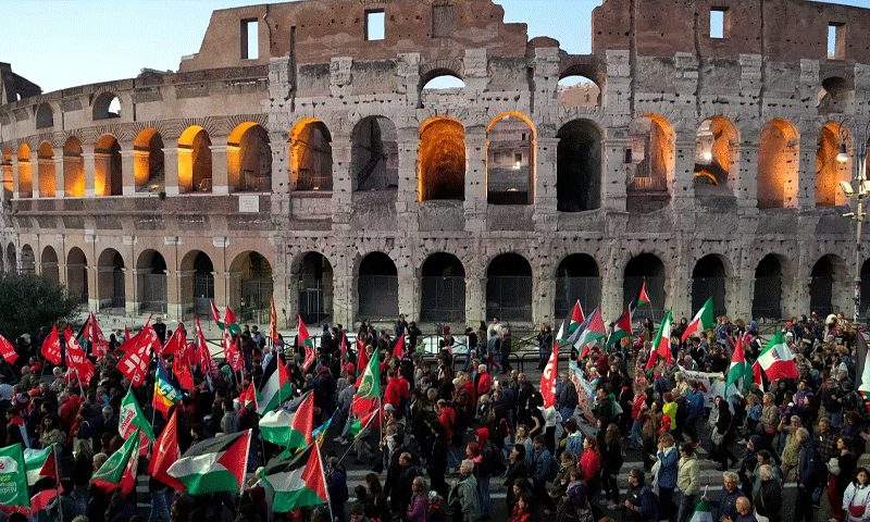 مظاہرین ہاتھوں میں بینرز اور جھنڈے تھامے ‘فری فلسطین’ اور دیگر نعرے لگاتے ہوئے کولوسیم کے قریب مرکزی شاہراہوں سے گزرے۔ مظاہرہ پُرامن رہا جس میں طلبا، بزرگ اور بچے بھی شریک ہوئے، تاہم ریلی کے اختتام پر کچھ مظاہرین پولیس سے الجھ پڑے۔