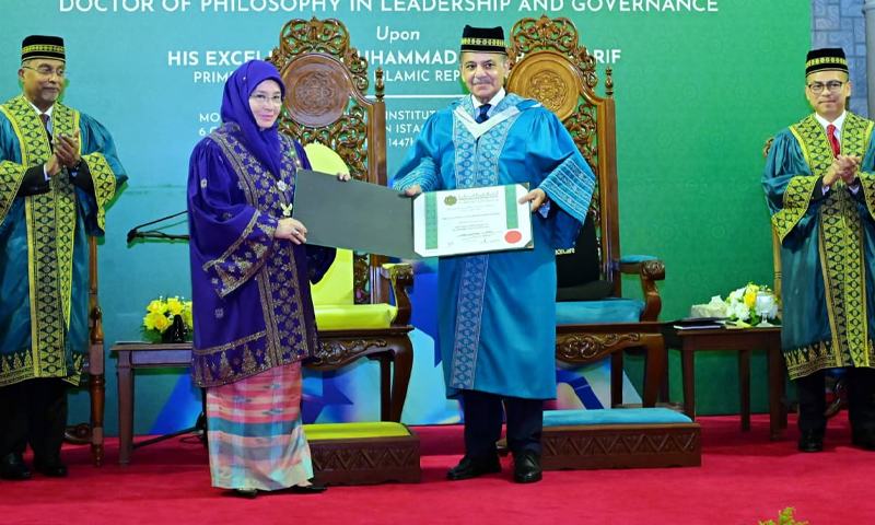 وزیراعظم پاکستان محمد شہباز شریف کو انٹرنیشنل اسلامک یونیورسٹی ملائیشیا کی جانب سے لیڈر شپ اور گورننس میں پی ایچ ڈی کی اعزازی ڈگری سے نوازا گیا، جس کے بعد اب وہ ڈاکٹر شہباز شریف بن چکے ہیں۔