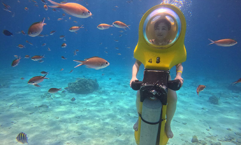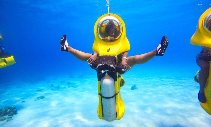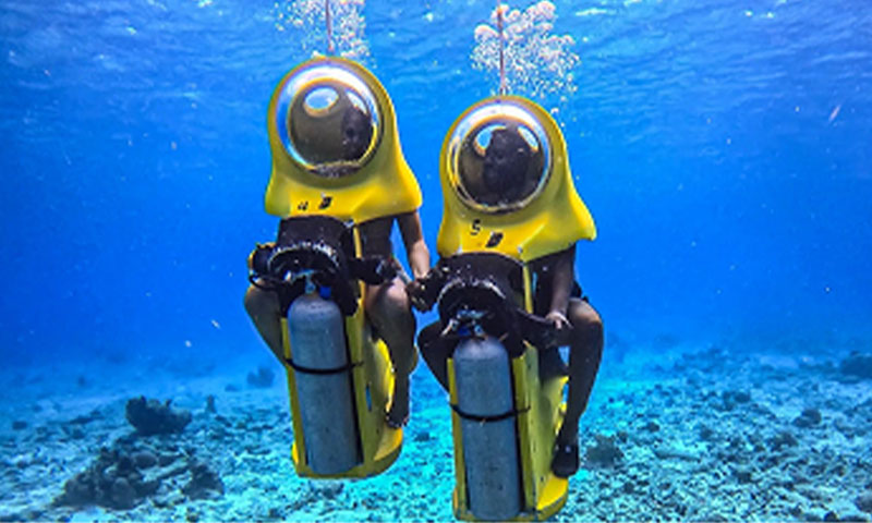 یہ جدید ’انڈر واٹر اسکوٹر‘ ببل ہیلمٹ کے ساتھ اس طرح تیار کی گئی ہے کہ سوار آسانی سے سانس لے سکتے ہیں اور قریباً 10 سے 15 فٹ گہرائی تک سمندر کی دنیا کا قریب سے نظارہ کر سکتے ہیں۔ کسی خاص تربیت کی ضرورت نہ ہونے کے باعث، یہ سرگرمی سیاحوں میں تیزی سے مقبول ہو رہی ہے۔