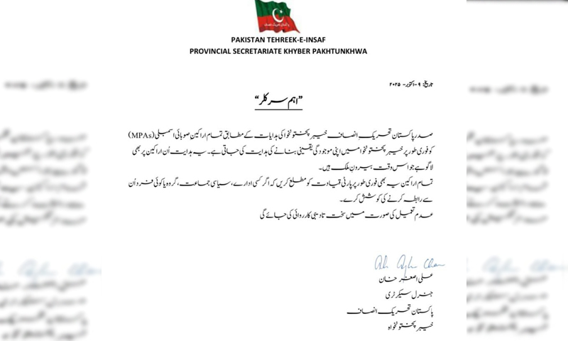 پی ٹی آئی خیبرپختونخوا کے جنرل سیکریٹری علی اصغر خان کی جانب سے جاری سرکلر میں کہا گیا ہے کہ چیئرمین کی ہدایت پر تمام اراکینِ اسمبلی، بشمول وہ جو بیرونِ ملک موجود ہیں، فوری طور پر خیبرپختونخوا واپس آئیں۔