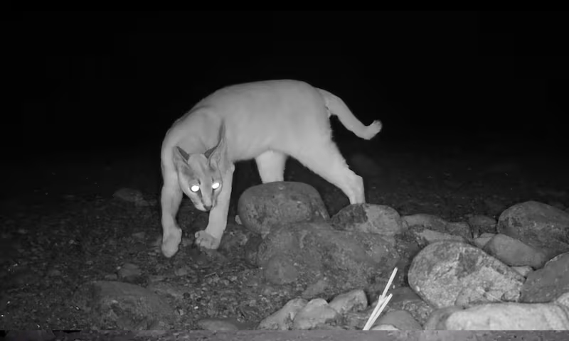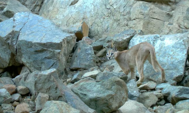 کراچی کے مغربی خشک پہاڑیوں میں نصب ایک خفیہ کیمرے نے نایاب جنگلی بلی کراکل کو علاقے سے گزرتے ہوئے ریکارڈ کیا ہے۔ یہ ویڈیو اس بات کا ثبوت ہے کہ پاکستان میں معدومی کے دہانے پر پہنچنے والی یہ خوبصورت مگر نایاب بلی اب بھی زندہ ہے۔