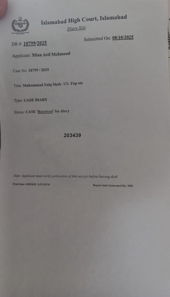 درخواست چیئرمین امن ترقی پارٹی فائق شاہ کی جانب سے دائر کی گئی، جسے عدالت نے ڈائری نمبر الاٹ کر دیا ہے۔