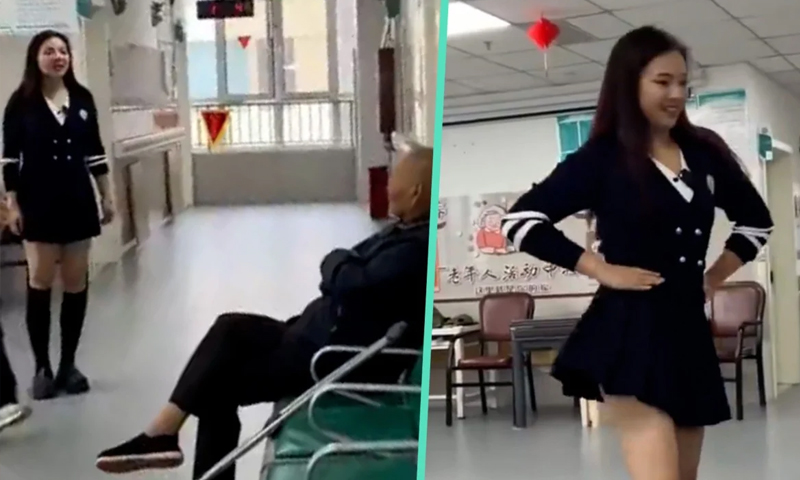 ساؤتھ چائنا مارننگ پوسٹ کے مطابق یہ ویڈیو 24 ستمبر کو ادارے کے تصدیق شدہ اکاؤنٹ سے پوسٹ کی گئی، ویڈیو میں خاتون کو مختصر یونیفارم نما لباس اور لمبے موزے پہنے بزرگ شخص کے سامنے ڈانس کرتے دیکھا جاسکتا ہے۔