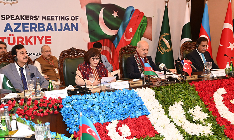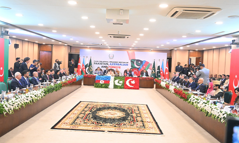 پاکستان، ترکیہ اور آذربائیجان کے مابین سہ فریقی اسپیکرز اجلاس کا تیسرا دور اسپیکر قومی اسمبلی سردار ایاز صادق کی زیر صدارت اسلام آباد میں اختتام پذیر ہوا، جس کے اعلامیے میں مسئلہ کشمیر اور فلسطین کے پُرامن حل، علاقائی تعاون کے فروغ، ماحولیاتی چیلنجز سے نمٹنے اور پارلیمانی روابط کے استحکام پر زور دیا گیا۔