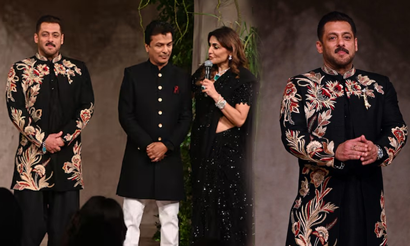 سلمان خان نے شو کا اختتام ایک شاندار کالی را سلک کی اوپن شیروانی میں کیا، جس پر نفیس ریشم کی کڑھائی کی گئی تھی۔ اس کے نیچے پن ٹک کرتا اور سیدھی پتلون پہنی گئی تھی، جس سے ایک شاہانہ اور جاذبِ نظر لک سامنے آئی۔ جبکہ کندھوں، سینے اور آستینوں پر گولڈن، میرون اور فوشیا پنک رنگوں میں پھولوں کی کشیدہ کاری نمایاں تھی۔ جس سے ایک شاہانہ اور جاذبِ نظر لک سامنے آئی۔