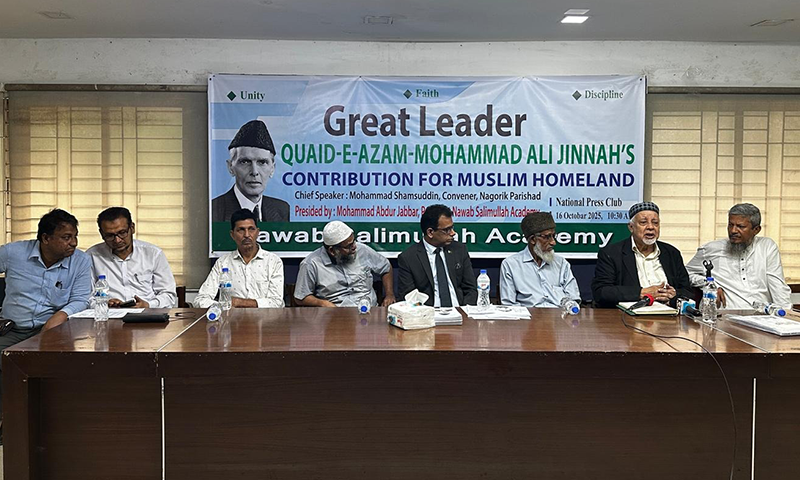 وہ جمعرات کی صبح ڈھاکہ میں نیشنل پریس کلب کے اکرم خان ہال میں نواب سلیم اللہ اکیڈمی کے زیرِ اہتمام ’عظیم رہنما قائداعظم محمد علی جناح کی مسلم وطن کے لیے خدمات‘ کے موضوع پر منعقدہ ایک مذاکرے میں بطورِ مہمانِ خصوصی خطاب کر رہے تھے۔