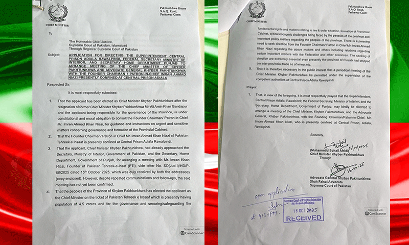 خیبرپختونخوا کے وزیرِاعلیٰ سہیل آفریدی نے چیف جسٹس پاکستان کے نام ایک باضابطہ خط لکھا ہے جس میں اڈیالہ جیل میں قید پاکستان تحریک انصاف کے بانی و پیٹرن ان چیف عمران احمد خان نیازی سے ملاقات کی اجازت دینے کی استدعا کی گئی ہے۔