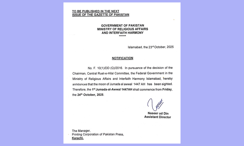 نوٹیفکیشن میں بتایا گیا ہے کہ جمادی الاول 1447 ہجری کی پہلی تاریخ جمعے کے روز 24 اکتوبر 2025 کو ہوگی۔