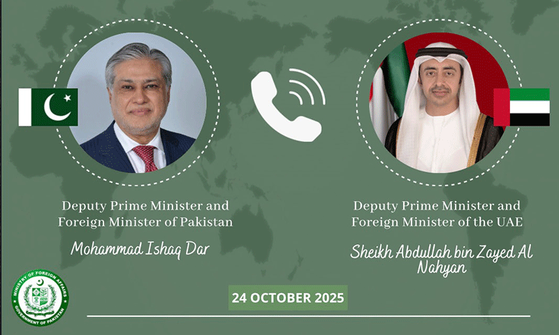 پاکستان کے نائب وزیرِاعظم و وزیرِ خارجہ سینیٹر محمد اسحاق ڈار اور متحدہ عرب امارات کے نائب وزیرِاعظم و وزیرِ خارجہ شیخ عبداللہ بن زاید النہیان کے درمیان گزشتہ رات دیر گئے ٹیلیفونک گفتگو ہوئی۔