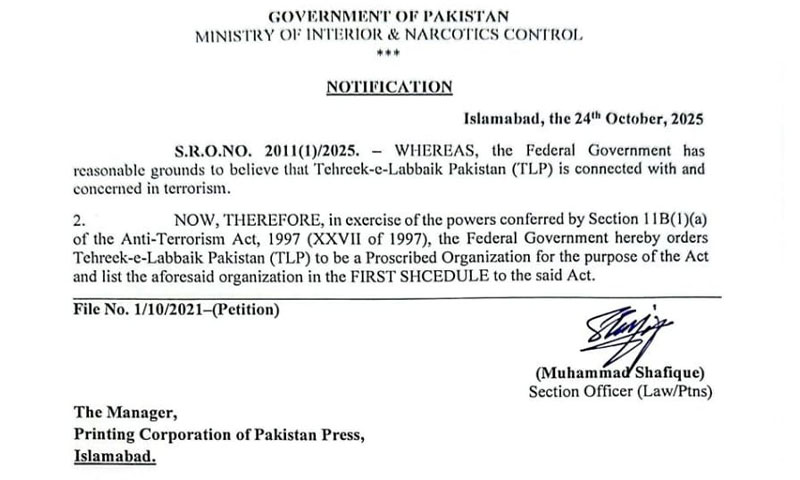 وفاقی حکومت نے تحریک لبیک پاکستان (ٹی ایل پی) کو انسدادِ دہشتگردی ایکٹ کے تحت کالعدم تنظیم قرار دیتے ہوئے باضابطہ نوٹیفکیشن جاری کر دیا ہے۔