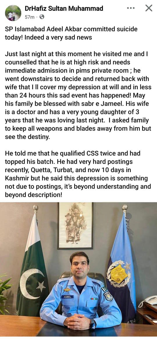 ڈاکٹر حافظ سلطان محمد نے سوشل میڈیا پر اپنی ایک تفصیلی پوسٹ میں بتایا کہ ’گزشتہ روز وہ مجھ سے ملنے آئے اور میں نے انہیں فوری طور پر پمز اسپتال کے پرائیویٹ وارڈ میں داخل ہونے کا مشورہ دیا تھا۔ وہ نیچے گئے تاکہ فیصلہ کریں، پھر اپنی اہلیہ کے ساتھ واپس آئے اور کہا کہ میں ڈپریشن پر خود قابو پا لوں گا، لیکن بدقسمتی سے 24 گھنٹے سے بھی کم وقت میں یہ افسوسناک واقعہ پیش آ گیا‘۔