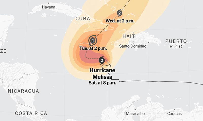 امریکا کے نیشنل ہریکین سینٹر (NHC) نے خبردار کیا ہے کہ سمندری طوفان ملیسا (Hurricane Melissa) نے بحرِ اوقیانوس کے وسطی حصے میں اپنی شدت بڑھا لی ہے اور آئندہ دنوں میں یہ کئی ملکوں کے لیے خطرہ بن سکتا ہے۔