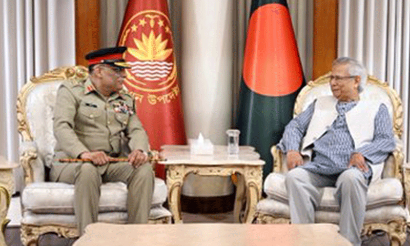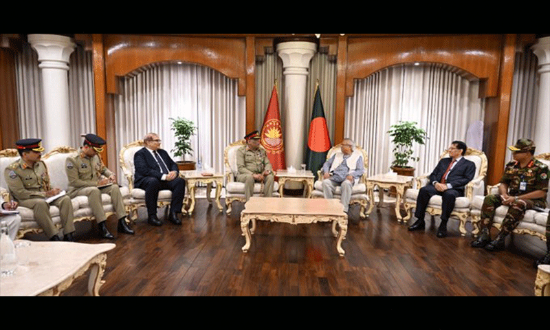پاکستان کے چیئرمین جوائنٹ چیفس آف اسٹاف کمیٹی (سی جے سی ایس سی) جنرل ساحر شمشاد مرزا نے ہفتہ کی شب ریاستی گیسٹ ہاؤس ’جمنا‘ میں بنگلہ دیش کے چیف ایڈوائزر پروفیسر محمد یونس سے ملاقات کی۔