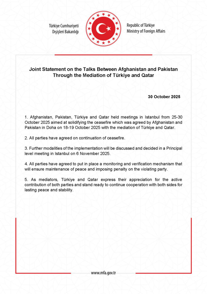 1۔ افغانستان، پاکستان، ترکیہ اور قطر نے 25 تا 30 اکتوبر 2025 کو استنبول میں اجلاس منعقد کیے، جن کا مقصد جنگ بندی کو مضبوط بنانا تھا۔ یہ وہی جنگ بندی ہے جو 18 تا 19 اکتوبر 2025 کو دوحہ میں ترکیہ اور قطر کی ثالثی میں افغانستان اور پاکستان کے درمیان طے پائی تھی۔