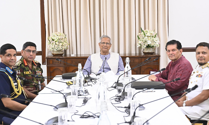 یہ اہم اجلاس ہفتہ کی شام اسٹیٹ گیسٹ ہاؤس جمنہ میں منعقد ہوا، جس میں آرمی چیف جنرل وقار الزمان، نیول چیف ایڈمرل محمد نذمول حسن اور ائیر فورس چیف ائیر چیف مارشل حسن محمود خان نے شرکت کی، جبکہ نیشنل سیکیورٹی ایڈوائزر ڈاکٹر خلیل الرحمن بھی موجود تھے۔