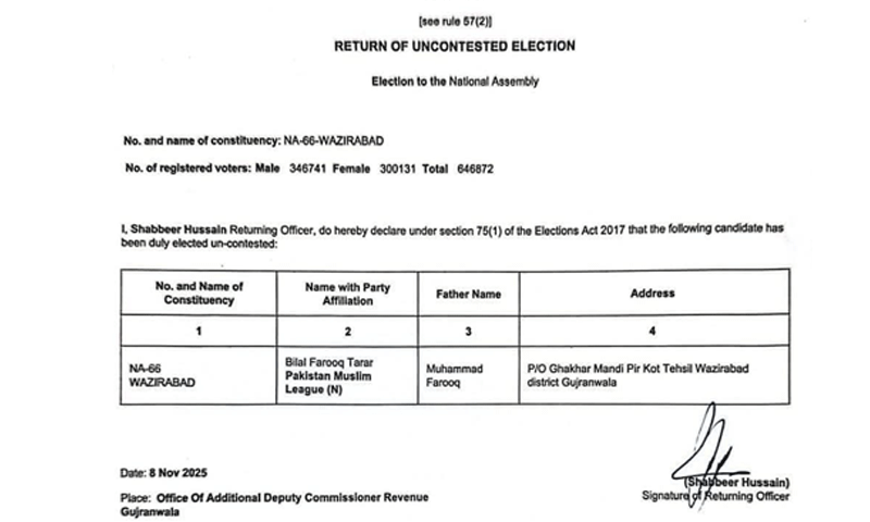 قومی اسمبلی کے حلقہ این اے 66 سے پاکستان مسلم لیگ (ن) کے امیدوار بلال فاروق تارڑ بلامقابلہ کامیاب ہو گئے، ریٹرننگ آفیسر شبیر حسین بٹ کی جانب سے سرکاری فارم 34 جاری کردیا گیا۔