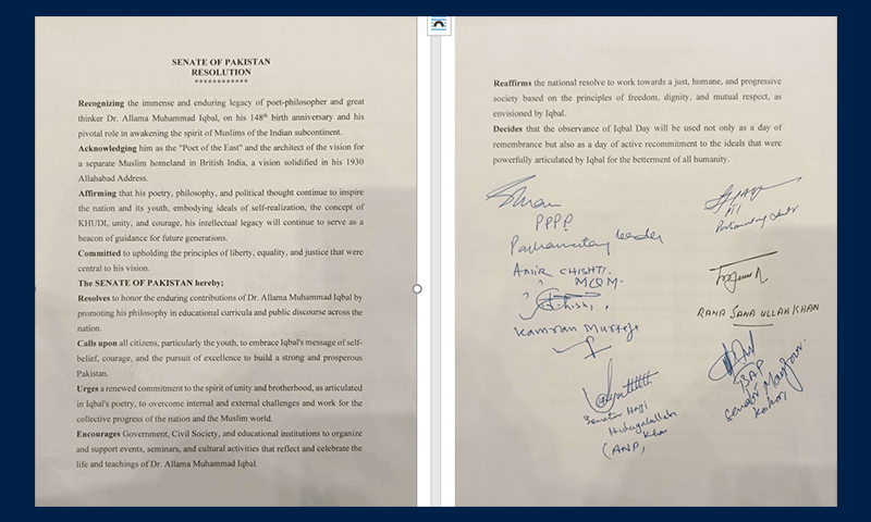 سینیٹ آف پاکستان نے شاعرِ مشرق، مفکرِ اسلام اور عظیم فلسفی ڈاکٹر علامہ محمد اقبالؒ کی 148ویں سالگرہ کے موقع پر ان کی قومی و فکری خدمات کو خراجِ عقیدت پیش کرنے کے لیے متفقہ قرارداد منظور کرلی۔