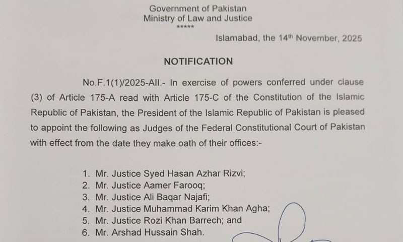 آئینی عدالت کے 6 ججز کی تقرری کا نوٹیفکیشن جاری، 3 ججز نے حلف اٹھا لیا