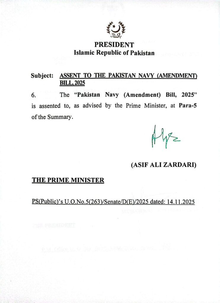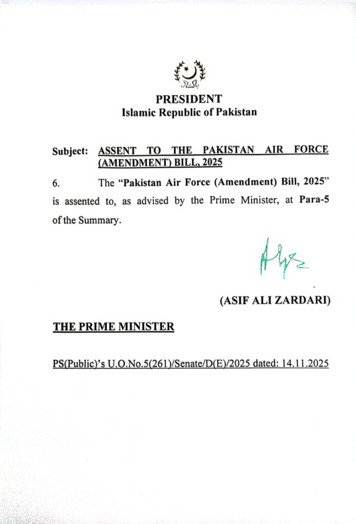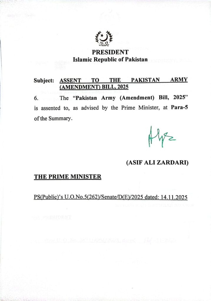 صدرِ مملکت آصف علی زرداری نے پاکستان آرمی (ترمیمی) بل 2025، پاکستان ایئر فورس (ترمیمی) بل 2025 اور پاکستان نیوی (ترمیمی) بل 2025 کی منظوری دے دی ہے۔