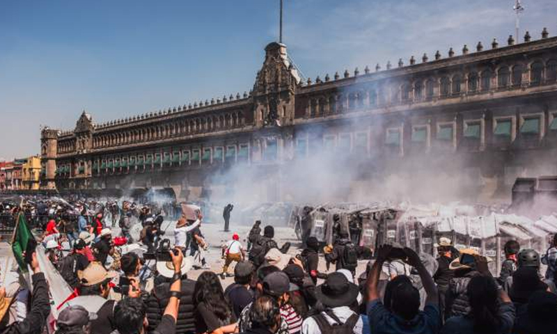 میکسیکو سٹی میں کچھ نقاب پوش افراد نے نیشنل پیلس کے باہر لگائی گئی رکاوٹیں گرادیں، جس کے بعد پولیس اور مظاہرین میں جھڑپ ہوئی۔ میڈیا رپورٹس کے مطابق پولیس نے آنسو گیس کا استعمال بھی کیا۔