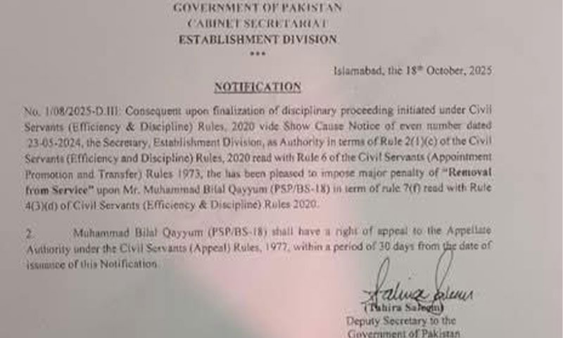 پولیس سروس آف پاکستان کے گریڈ 18 کے افسر محمد بلال قیوم کو جعلی کرنسی کے معاملے میں نوکری سے برطرف کر دیا گیا ہے۔