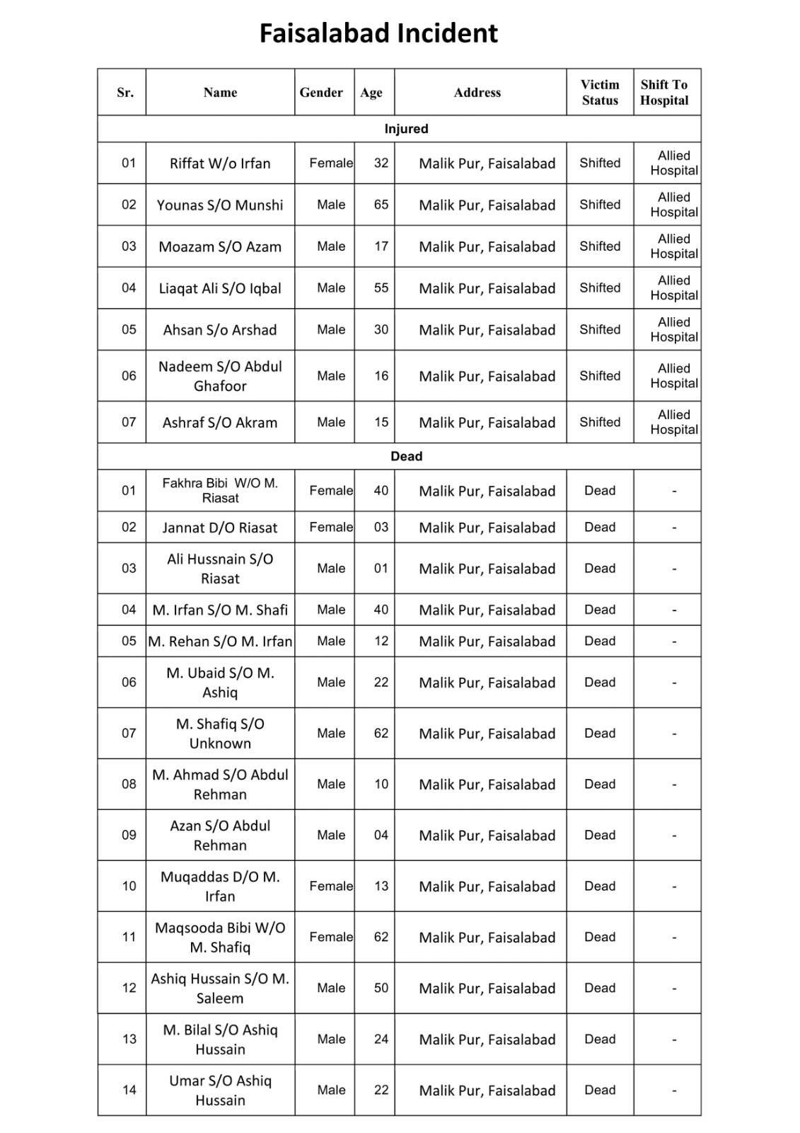 ابتدائی اطلاعات کے مطابق اب تک 14 افراد جاں بحق اور 7 زخمی ہو چکے ہیں۔ زخمیوں کو فوری طور پر اسپتال منتقل کیا گیا ہے اور ڈیڈ باڈیز کی بھی منتقلی عمل میں ہے۔