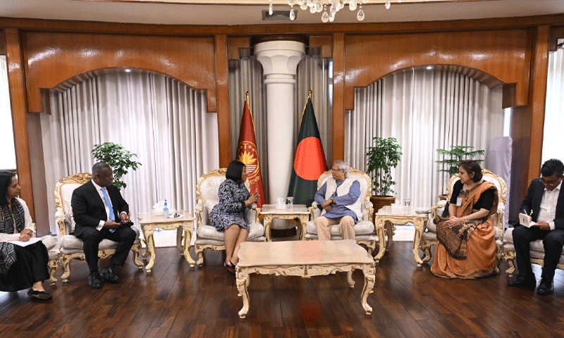 اسٹیٹ گیسٹ ہاؤس جمنہ میں کامن ویلتھ کی سیکریٹری جنرل شرلی آیورکور بوچوے سے ملاقات کے دوران پروفیسر یونس نے سیاسی عبوری دور میں بین الاقوامی تعاون کی اہمیت پر زور دیا۔