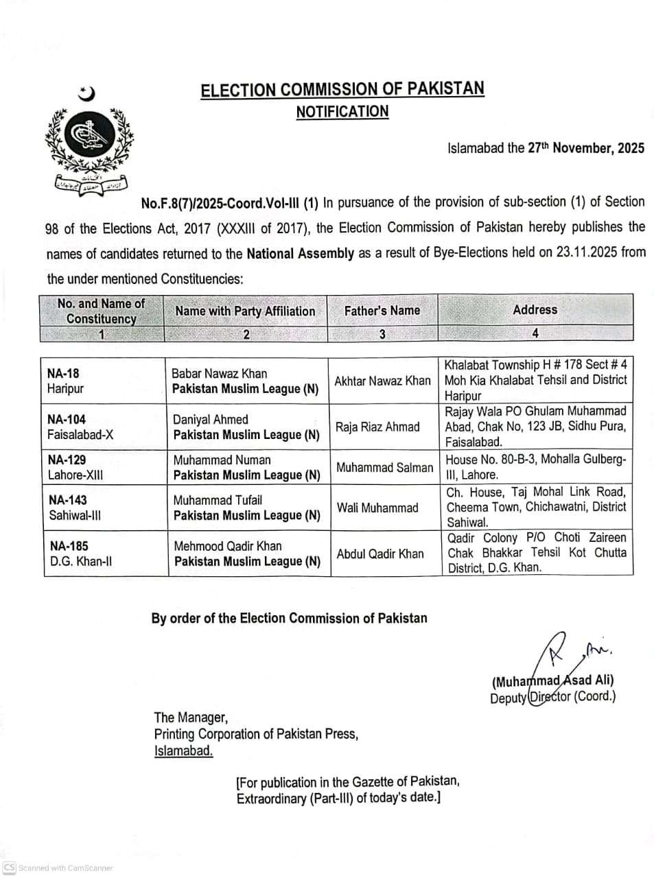 الیکشن کمیشن نے قومی اسمبلی کی 6 میں سے 5 نشستوں کے کامیاب امیدواروں کا نوٹیفکیشن جاری کیا۔ ہری پور سے مسلم لیگ ن کے بابر بواز کو کامیاب قرار دیا گیا۔ این اے 104 فیصل آباد سے دانیال احمد، این اے 129 لاہور سے محمد نعمان جبکہ این اے 143 ساہیوال اور این اے 185 ڈیرہ غازی خان سے بالترتیب محمد طفیل اور محمود قادر کو کامیاب قرار دیا گیا ہے۔