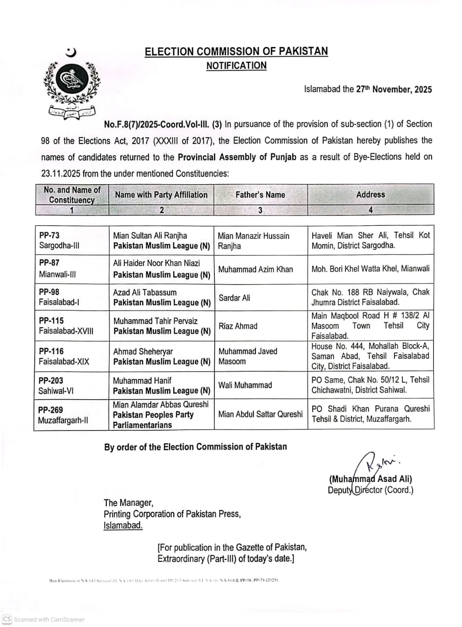 پنجاب اسمبلی کی 7 نشستوں پر ضمنی انتخابات میں کامیاب امیدواروں کو بھی نوٹیفائی کردیا گیا ہے۔ پی پی 73 سرگودھا سے سلطان علی رانجھا، پی پی 87 میانوالی سے علی حیدر خان نیازی، پی پی 98 فیصل آباد سے اعزاز علی تبسم، پی پی 115 فیصل آباد سے طاہر پرویز، پی پی 116 فیصل آباد سے احمد شہریار، پی پی 203 ساہیوال سے محمد حنیف اور پی پی 269 مظفرگڑھ سے میاں علمدار عباس قریشی کی کامیابی کا نوٹیفکیشن جاری کیا گیا ہے۔