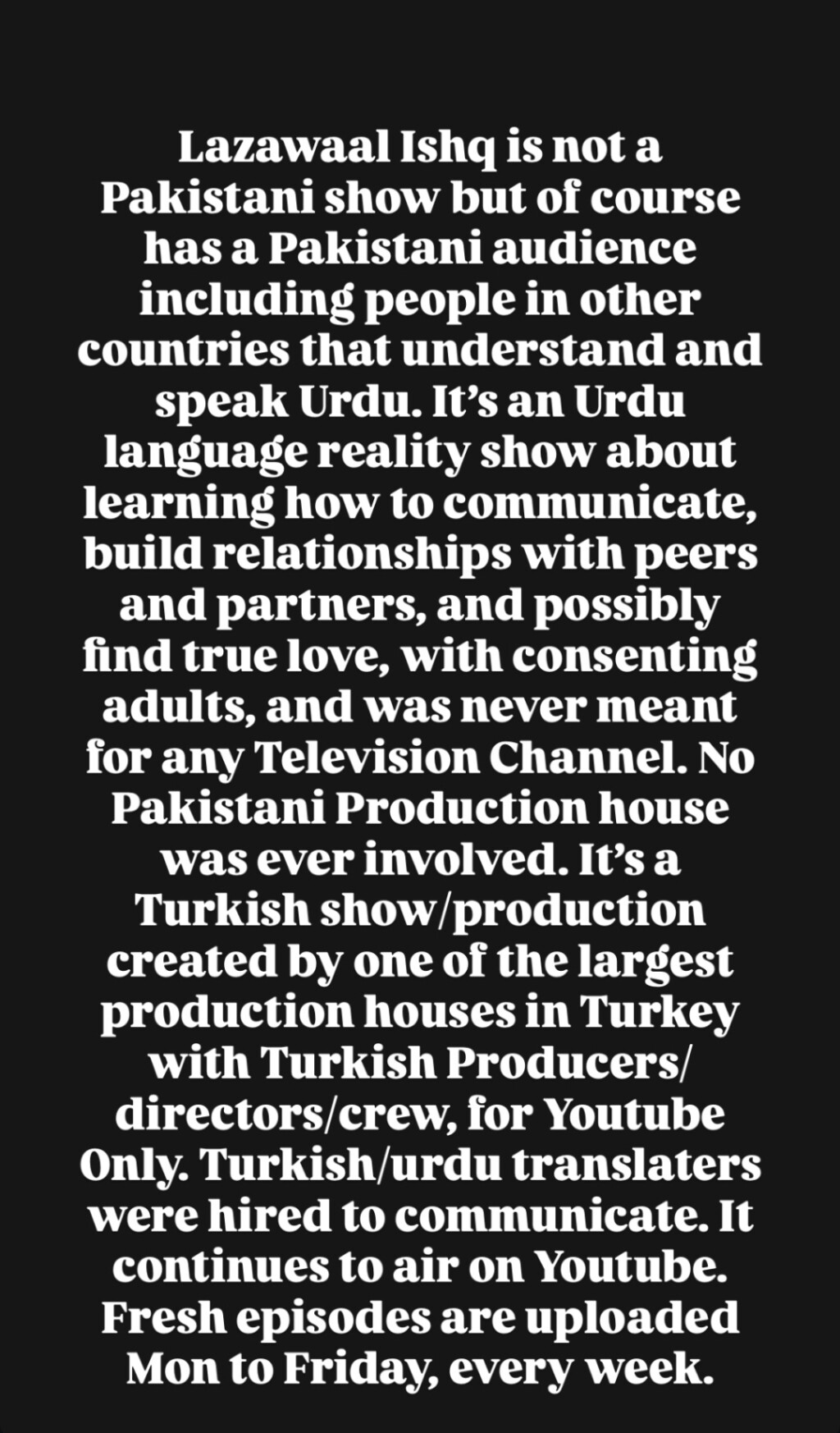 اداکارہ نے کہا کہ ’یہ ایک اُردو زبان کا رئیلٹی شو ہے جس میں سکھایا جاتا ہے کہ بات چیت کیسے کی جائے، ہم عمر افراد اور پارٹنرز کے ساتھ تعلقات کیسے بنائے جائیں، اور شاید حقیقی محبت بھی مل جائے یہ سب بالغ اور رضامند افراد کے درمیان ہوتا ہے۔ اسے کبھی بھی کسی ٹی وی چینل پر نشر کرنے کا ارادہ نہیں تھا۔ کوئی پاکستانی پروڈکشن ہاؤس اس میں شامل نہیں تھا۔ یہ ترکی کی سب سے بڑی پروڈکشن کمپنیوں میں سے ایک نے بنایا ہے‘۔