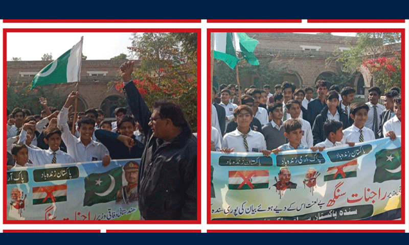 بھارتی وزیرِ دفاع راج ناتھ سنگھ کے اشتعال انگیز بیان کے خلاف سندھ کے مختلف شہروں میں طلبہ، اساتذہ اور شہریوں کی جانب سے احتجاجی ریلیاں نکالی گئیں جن میں عوام نے سخت غم و غصے کا اظہار کیا۔
