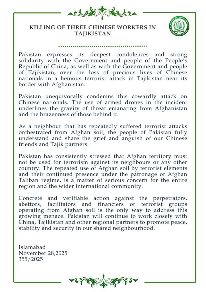 پاکستانی دفتر خارجہ نے تاجکستان میں افغانستان کی سرحد کے قریب چینی شہریوں پر ہونے والے دہشتگرد حملے کی شدید مذمت کرتے ہوئے چین اور تاجکستان کی حکومتوں اور عوام سے دلی تعزیت کا اظہار کیا ہے۔