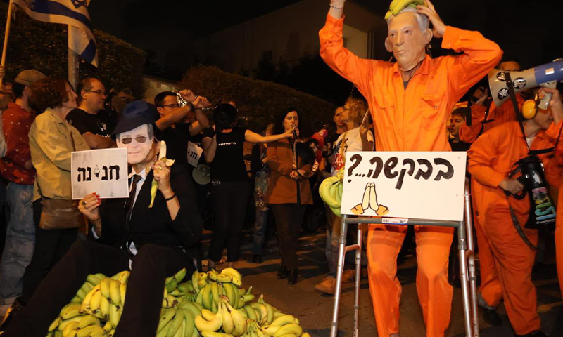 احتجاج میں شریک ایک شہری نے قیدیوں والا نارنجی لباس پہن کر نیتن یاہو کی ’علامتی گرفتاری‘ دکھائی جبکہ دیگر افراد نے کیلے سے بھرے ڈھیر کے ساتھ ’معافی‘ کا بڑا بورڈ اٹھا رکھا تھا۔