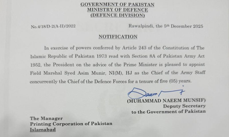 صدر مملکت آصف علی زرداری کی منظوری کے بعد یہ نوٹیفکیشن جاری کیا گیا ہے۔ فیلڈ مارشل عاصم منیر کی تعیناتی آئین پاکستان کی شق 243 اور آرمی ایکٹ کی شق 8 اے کے تحت 5 سال کے لیے کی گئی ہے۔