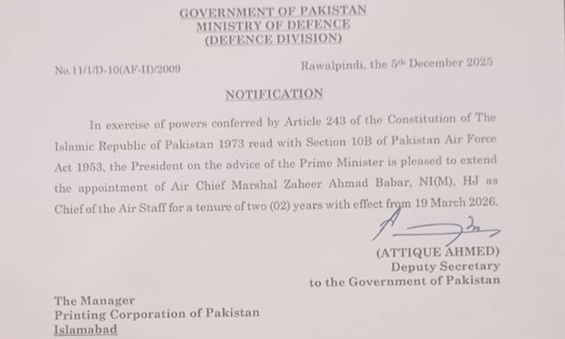 اسی دوران، وزارت دفاع نے سربراہ پاک فضائیہ ایئر چیف مارشل ظہیر احمد بابر سدھو کی مدت ملازمت میں 2 سال کی توسیع کا نوٹیفکیشن بھی جاری کیا ہے۔ یہ توسیع 19 مارچ 2026 سے مؤثر ہوگی اور آئین پاکستان کی شق 243 اور ایئر فورس ایکٹ کی شق 10 بی کے تحت کی گئی ہے۔