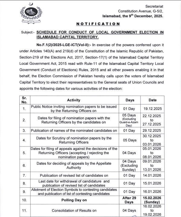 الیکشن کمیشن آف پاکستان نے اسلام آباد میں بلدیاتی انتخابات کے انعقاد کا شیڈول جاری کرتے ہوئے اعلان کیا ہے کہ وفاقی دارالحکومت میں پولنگ 15 فروری 2026 کو ہوگی۔